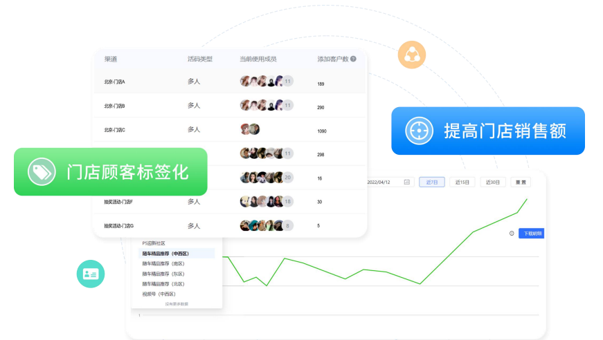 圈量的“渠道活码”能够实现千人一码,按照门店、导购进行分流,后台清晰统计渠道活码获客数据,帮助企业了解各渠道门店、成员引流效果。