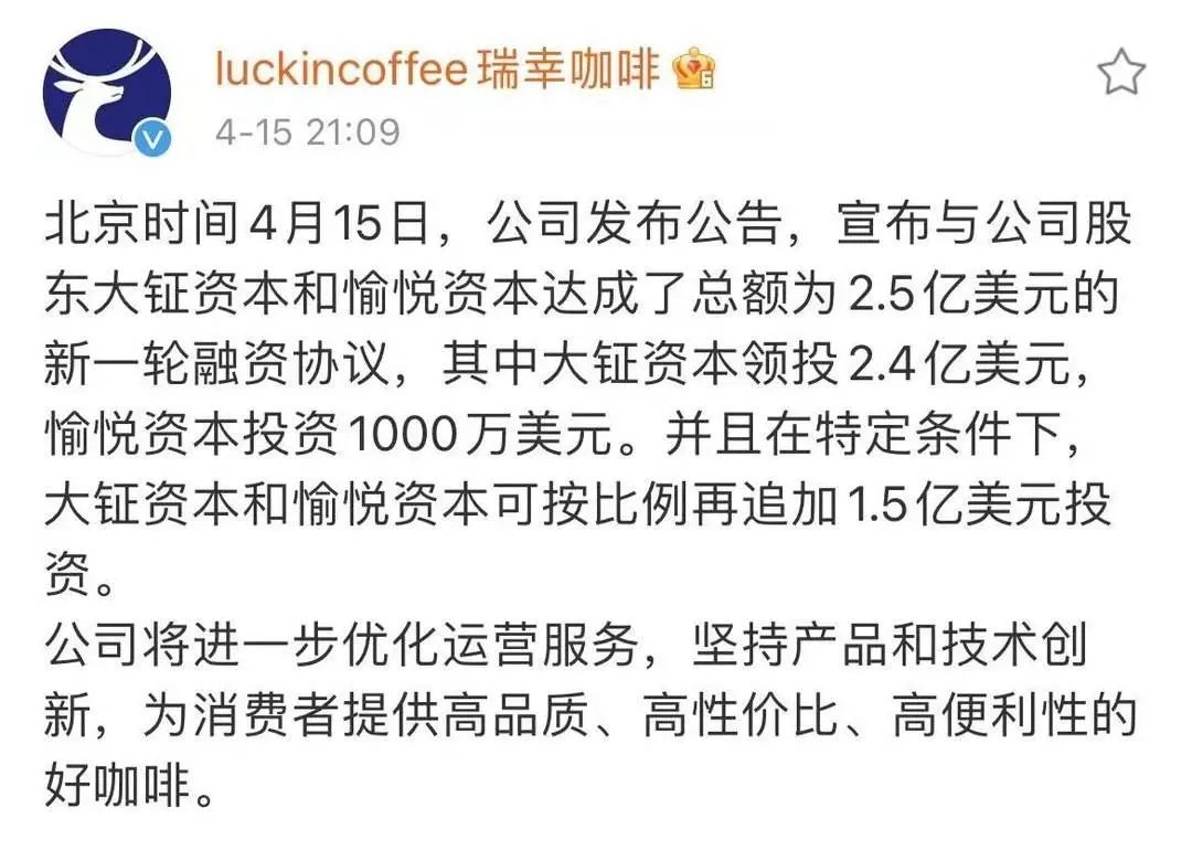 4月15日,瑞幸宣布与公司股东大钲资本和愉悦资本达成了总额为2.5亿美元的新一轮融资协议,“小蓝杯”再次焕发生机。