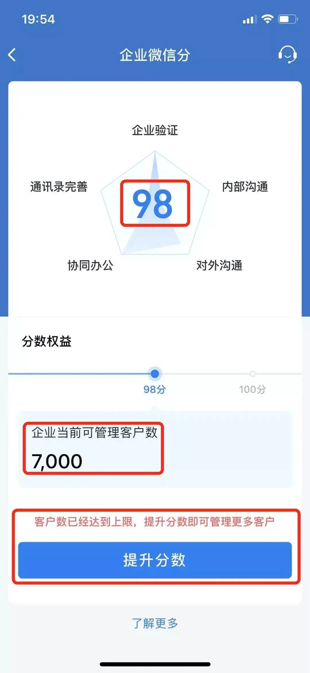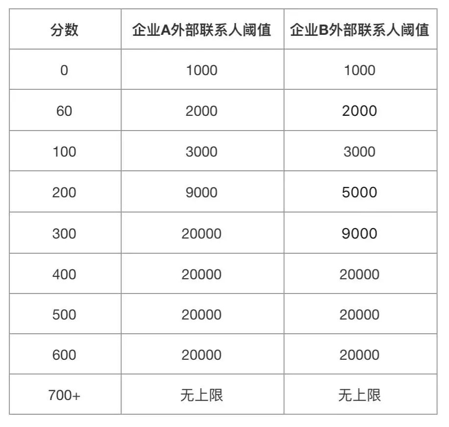 分数越高,外部联系人额度越高。如60分可添加最多2000个外部联系人;400分可以添加20000外部联系人;700分则可以无限添加外部联系人,具体情况如下图: