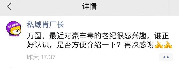 这段平平无奇的文案,帮豪车毒获得了几十万的朋友圈曝光,还有100多个找上门的VC,新增30000+私域客户。通过裂变拓展私域流量,豪车毒一下子卖出2台库利南,3台宾利,2台法拉利,加起来整整5000万的销售额!