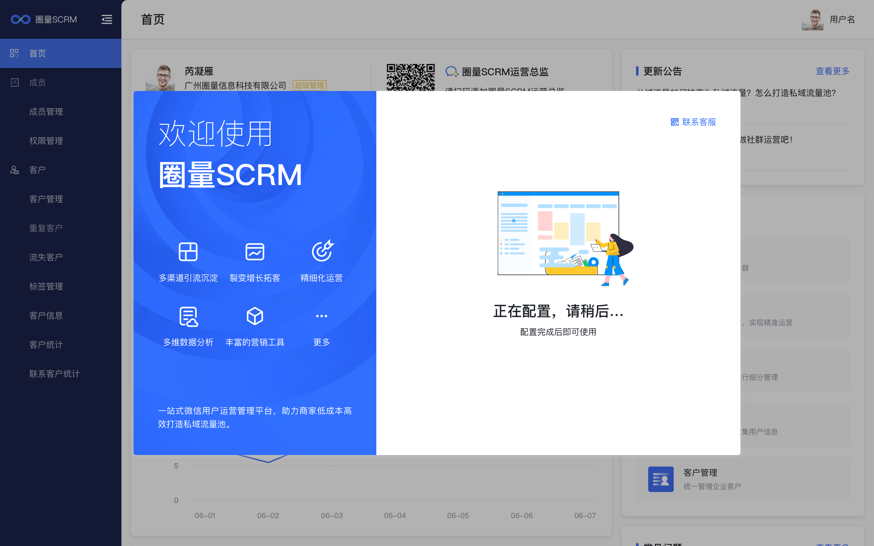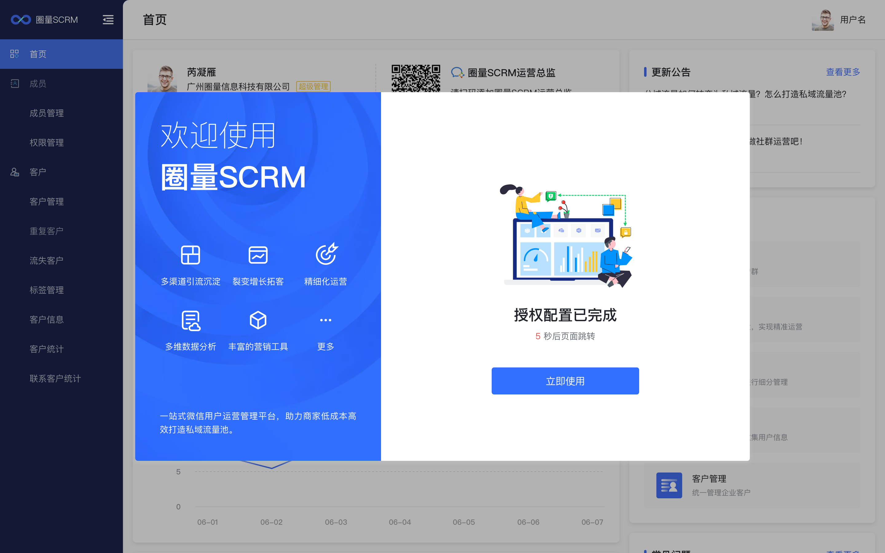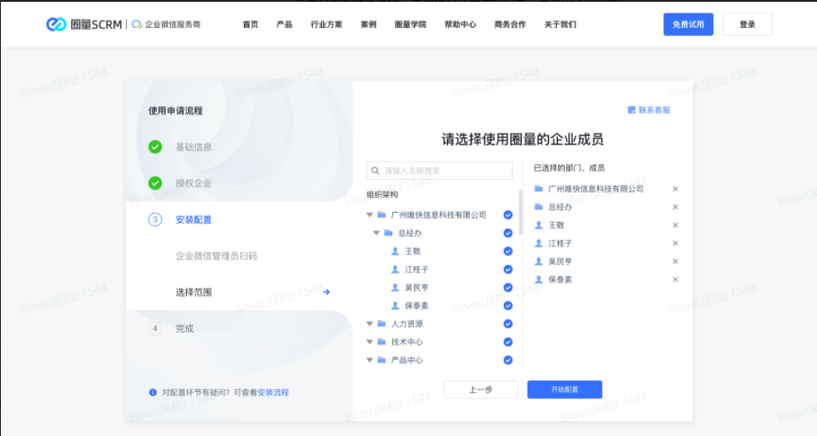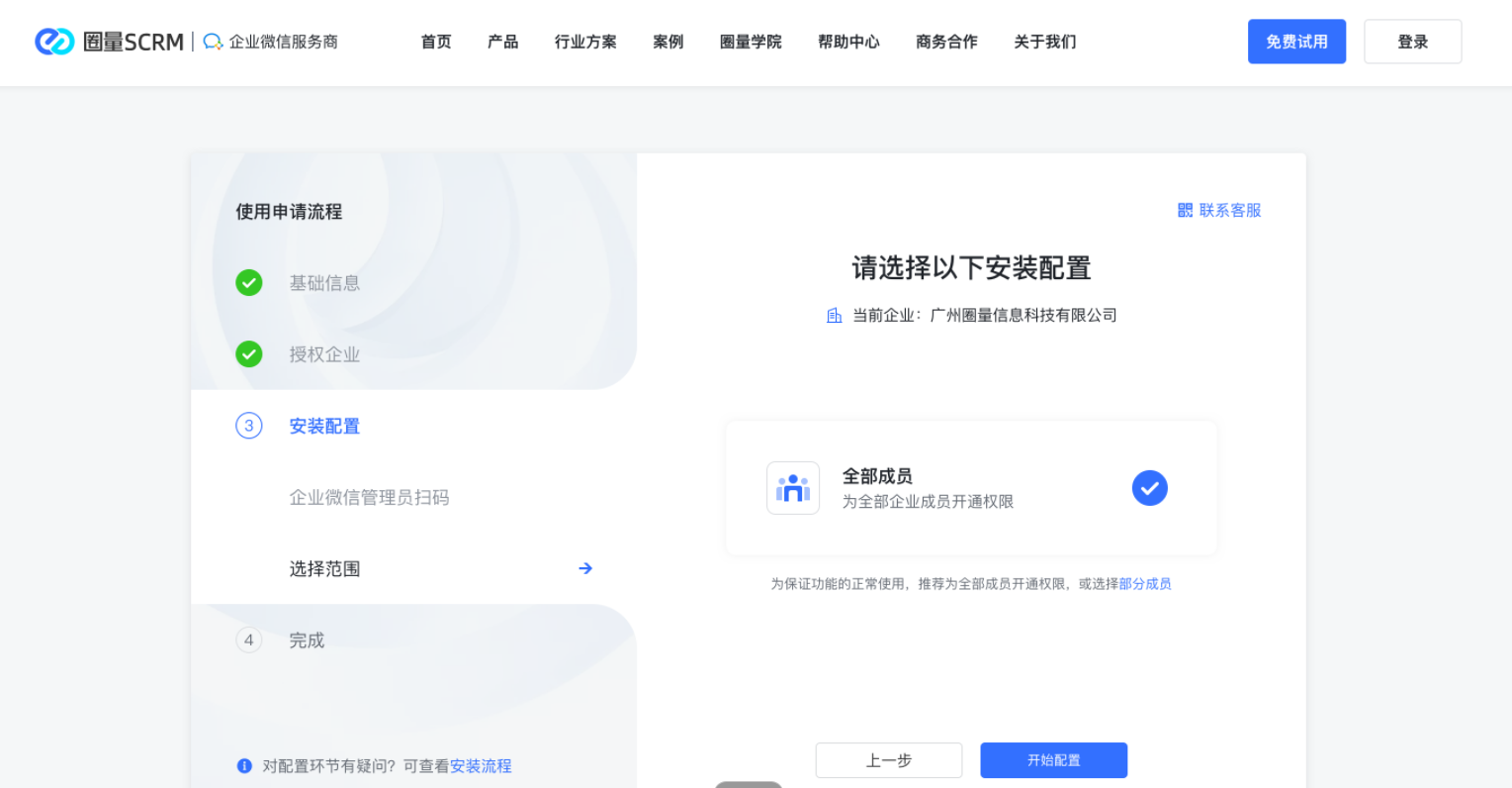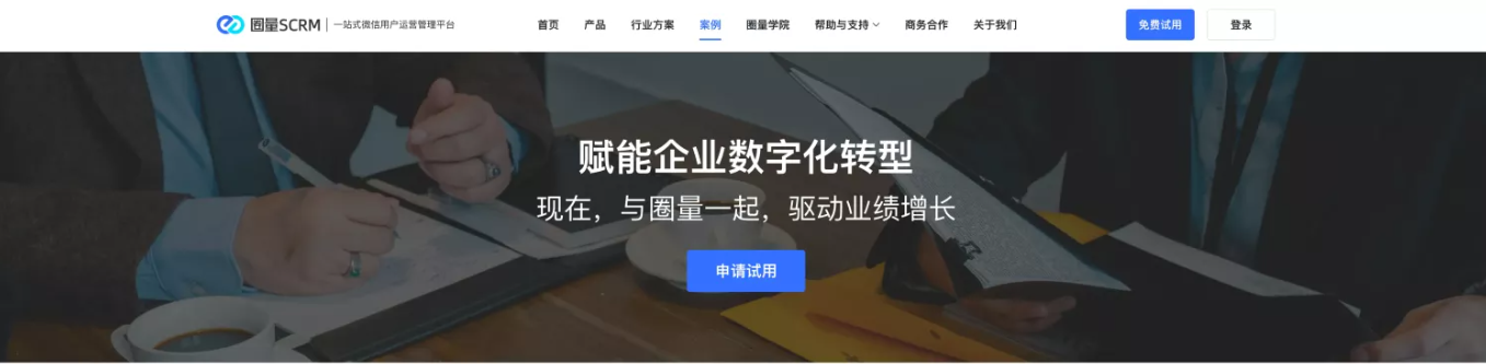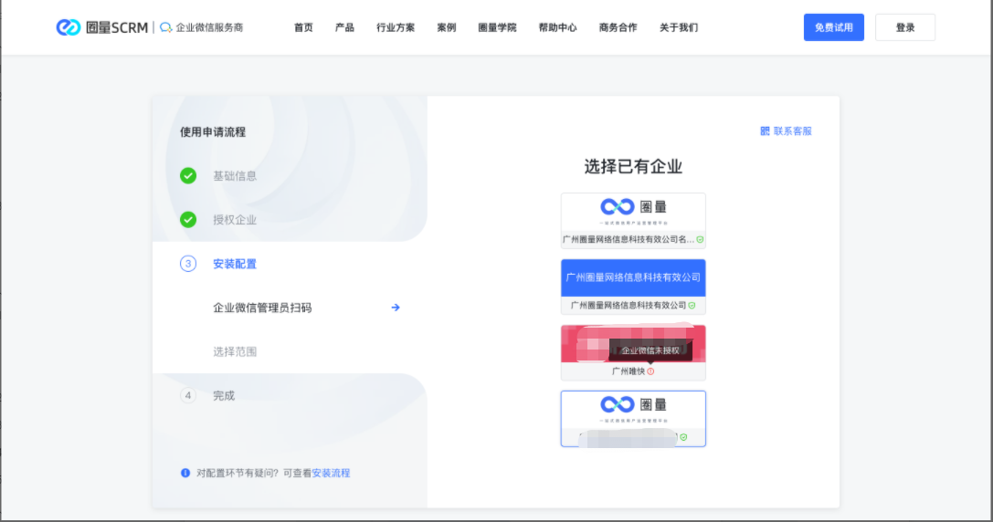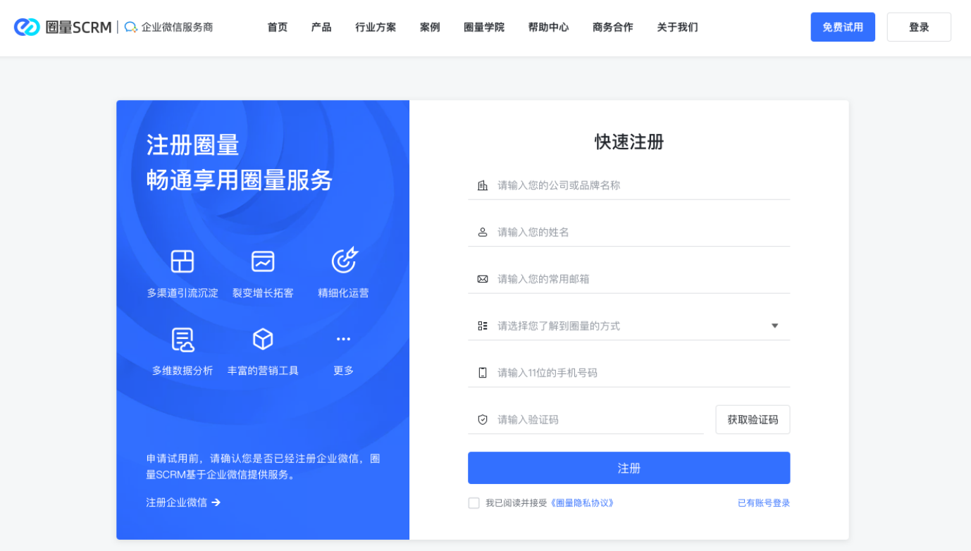 登录圈量官网,点击右上角【免费试用】,进入申请注册流程(建议在申请前,提前注册好企业微信并完成认证。以便更好地使用圈量产品功能)。