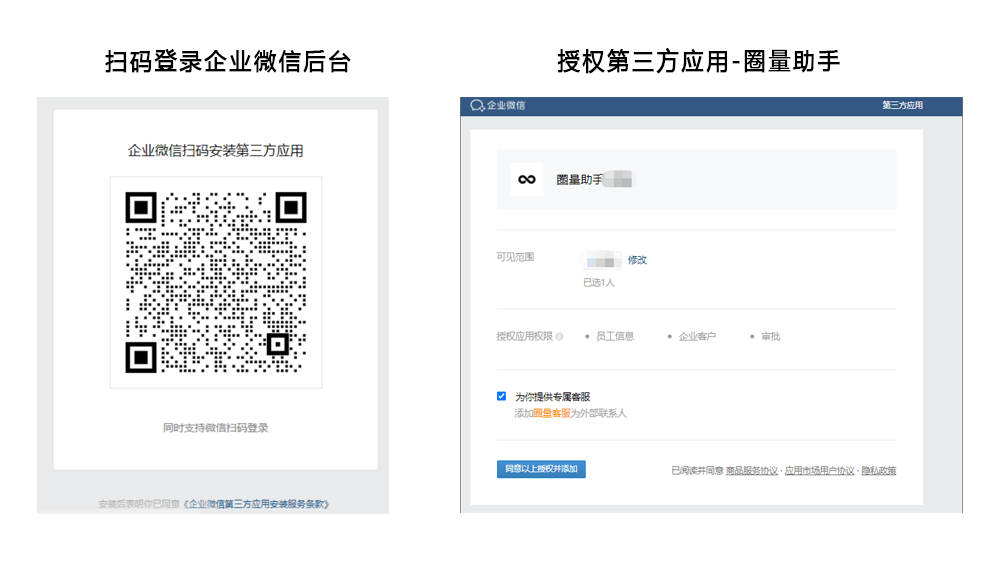 ①使用企业微信管理员账号或与之绑定的个人微信账号扫码授权,进入应用安装流程。