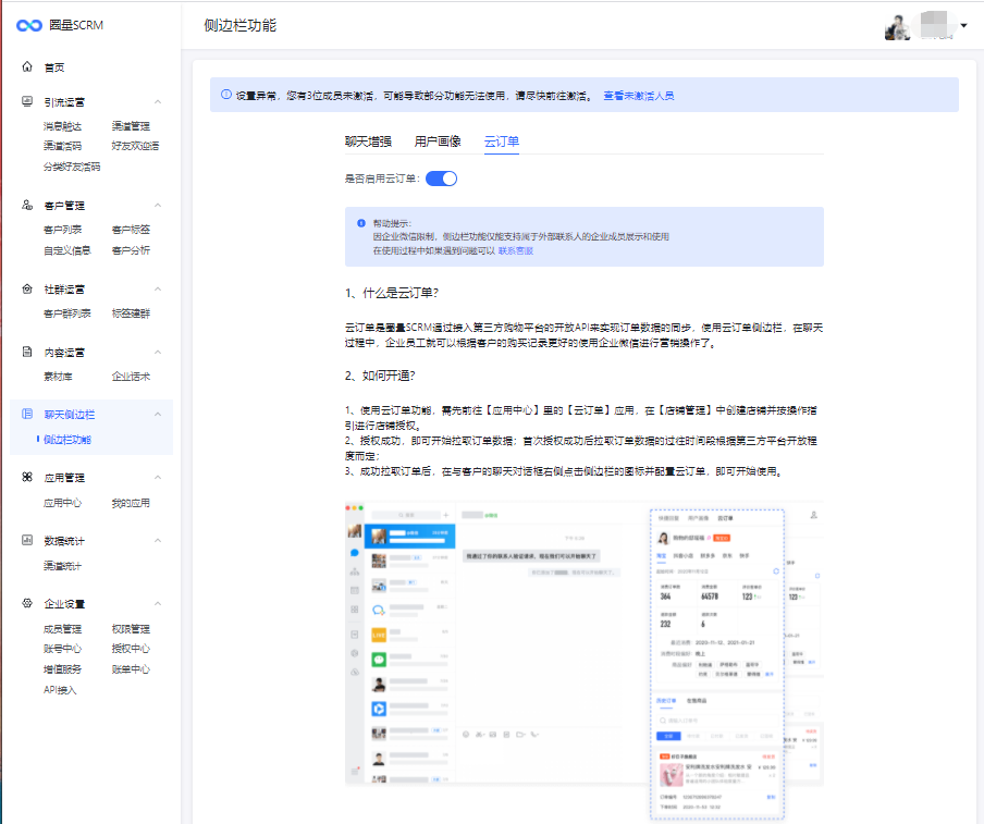 开启云订单后,企业成员可在聊天侧边栏中使用云订单功能。云订单功能通过接入第三方购物平台的开放API来实现订单数据的同步。