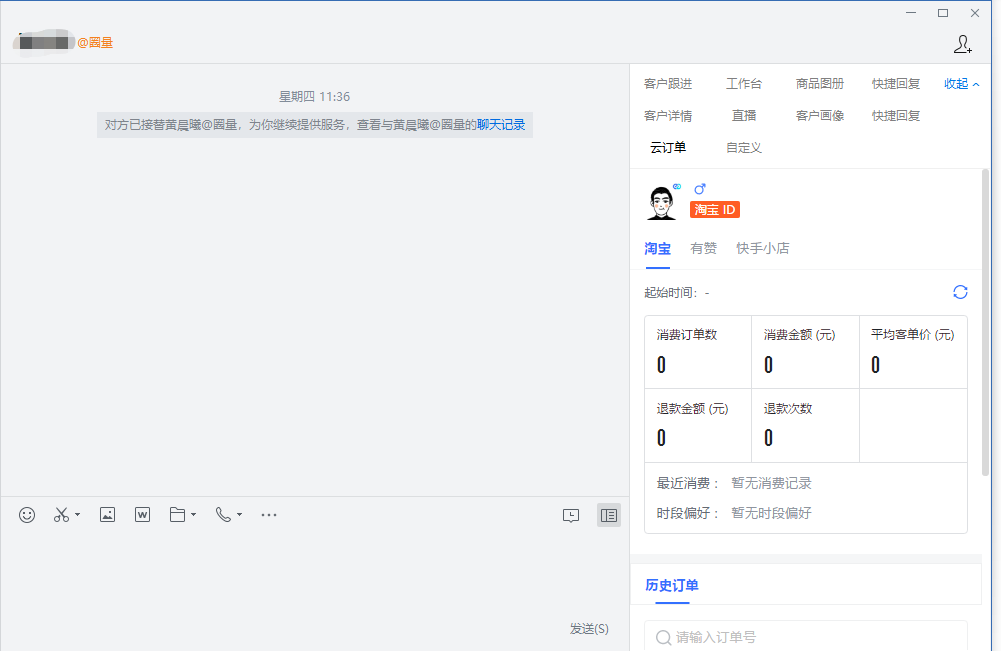 使用云订单侧边栏,在聊天过程中,员工可以查看客户在企业店铺中的消费数据以及历史订单。
