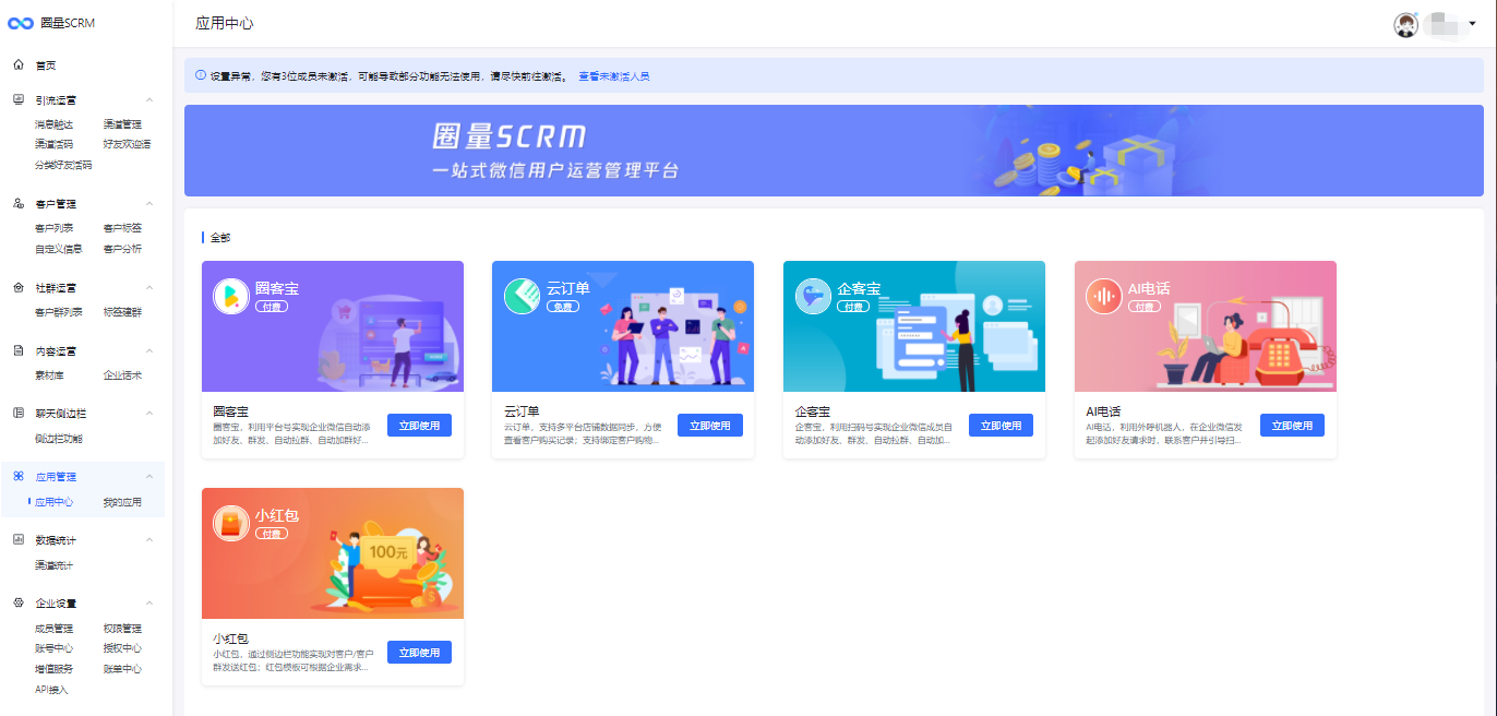 1)应用中心提供多种应用,企业可根据自己的需要进行购买使用。点击应用中心-应用-立即添加即可。若是收费应用则需要付费成功后,才能使用应用。