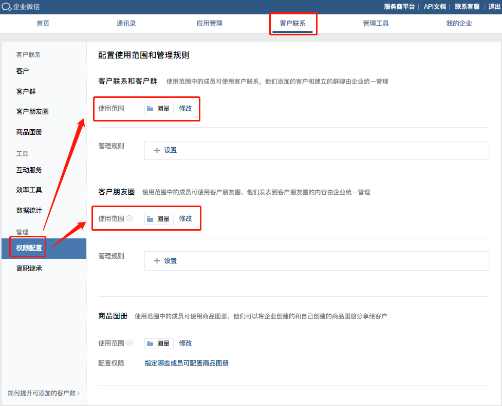 (1)登陆企业微信管理后台,进入路径:【客户联系】-【权限配置】。