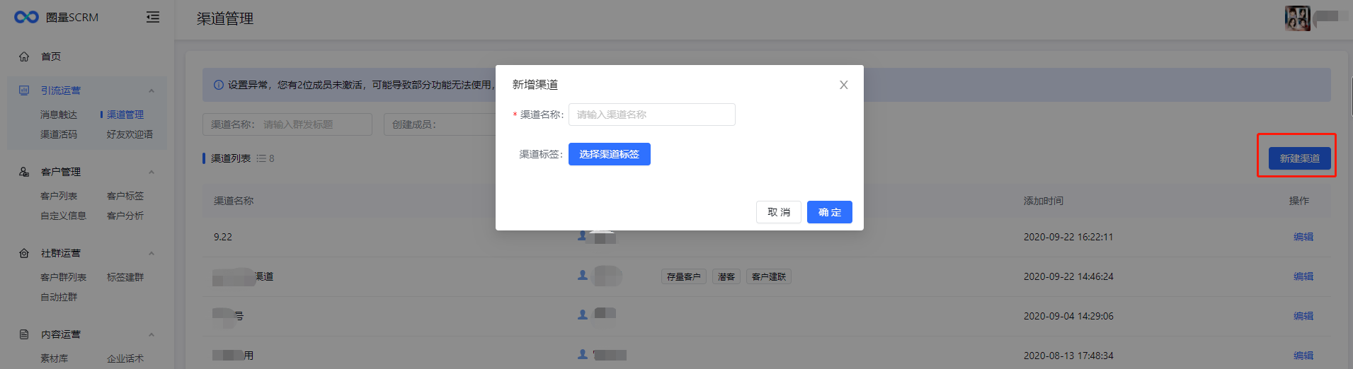 创建渠道:点击【新增渠道】,输入渠道名称,选择客户标签即可完成创建。已添加的渠道支持编辑修改。