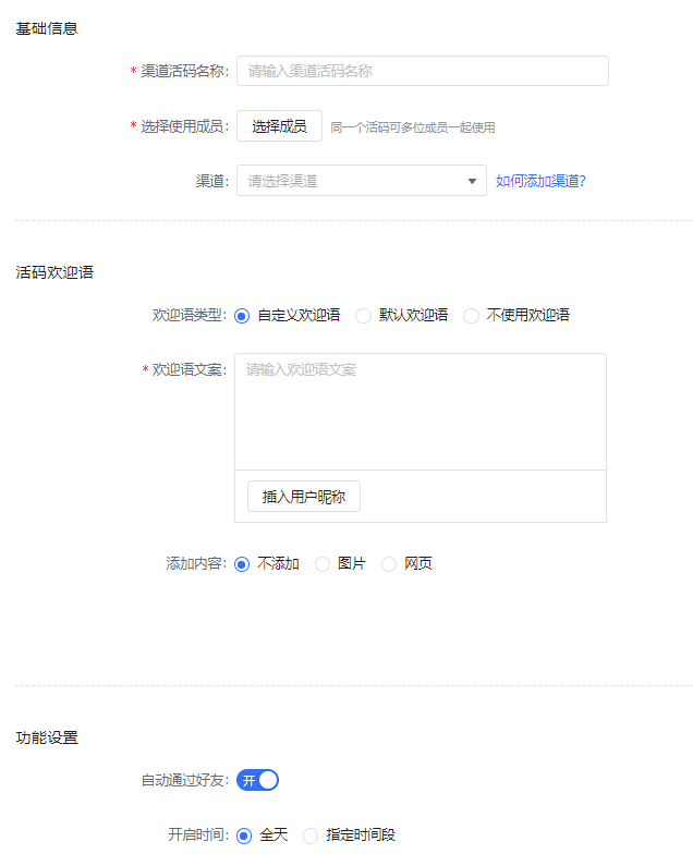 - 欢迎语类型:支持自定义欢迎语或使用成员已关联欢迎语。