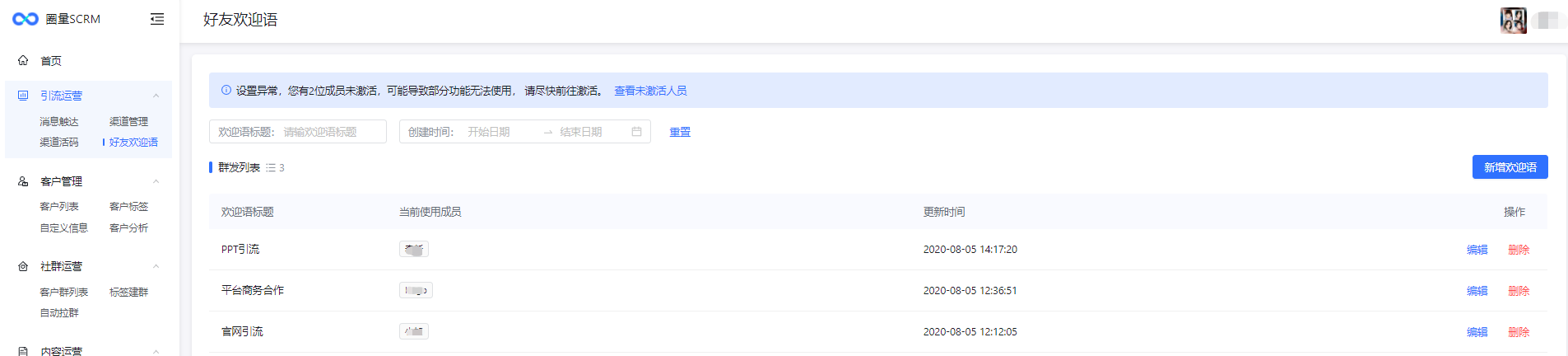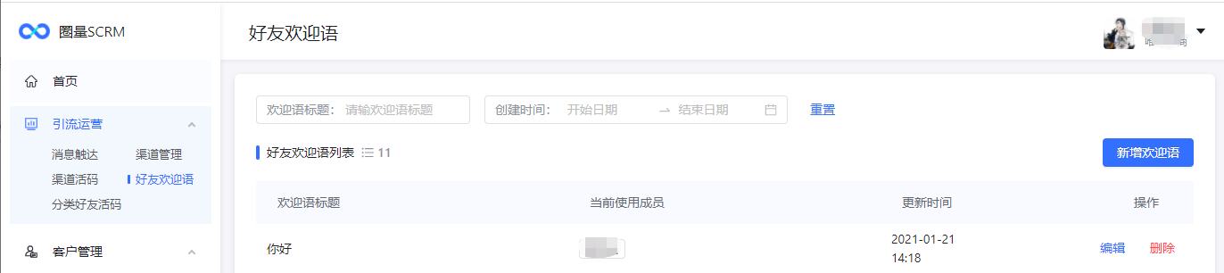 已创建好友欢迎语支持编辑、删除。