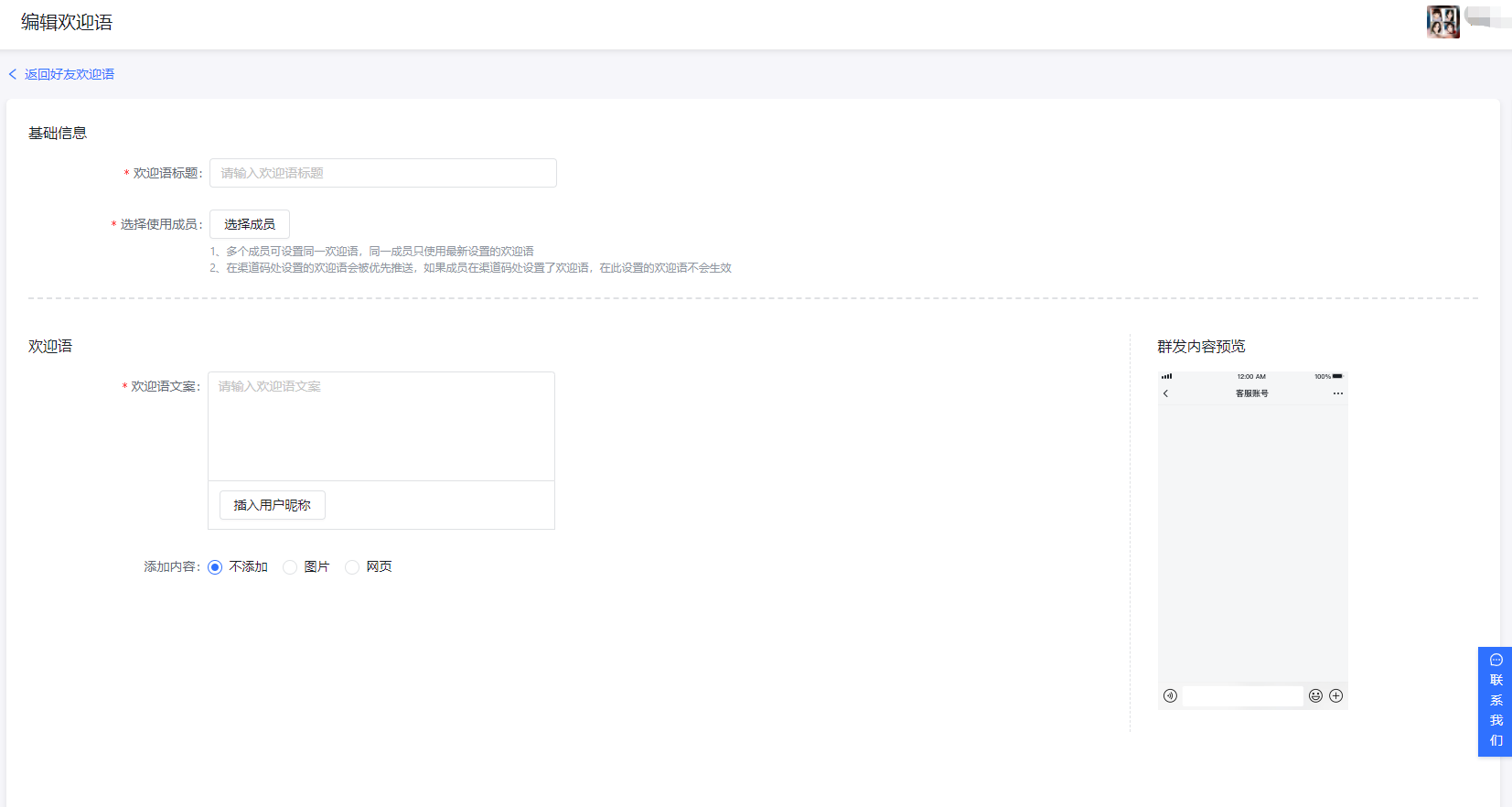 - 欢迎语标题:用于内部查看,不超过20字。