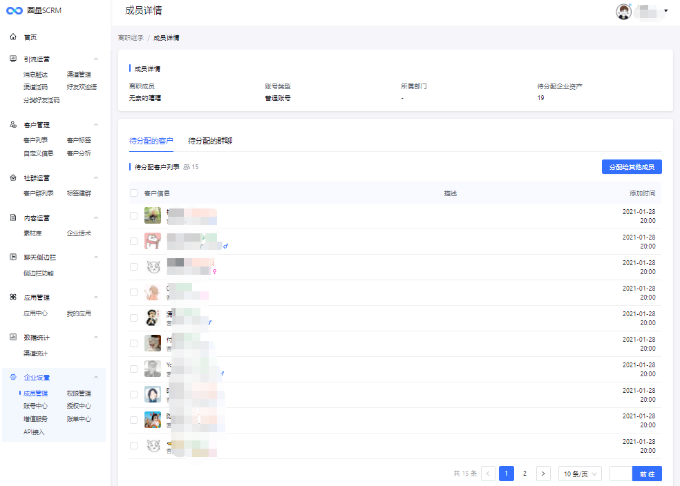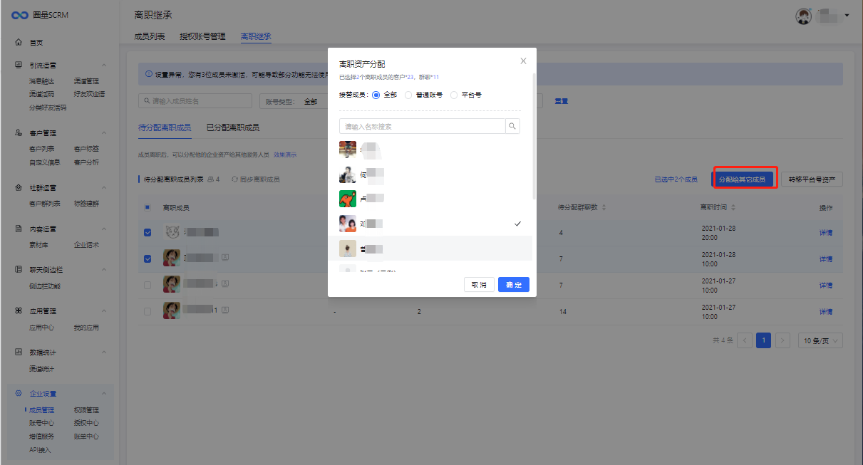 勾选离职成员,点击【分配给其他成员】,可将该离职成员客户、群聊继承给其他企业成员。