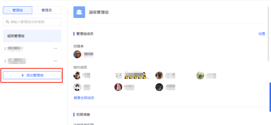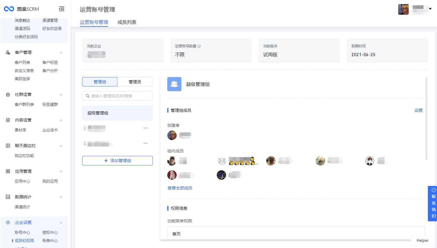 【超级管理组】为系统默认管理组。企业申请注册圈量的企微账号会成为该组的首个成员以及创建者(创建者身份可转让),【超级管理组】的组内成员拥有所有圈量功能权限及数据查看权限。