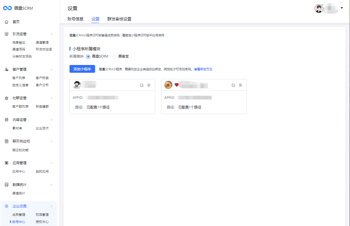 可在该模块绑定小程序,以便在使用圈量SCRM&圈客宝消息触达功能时调用。