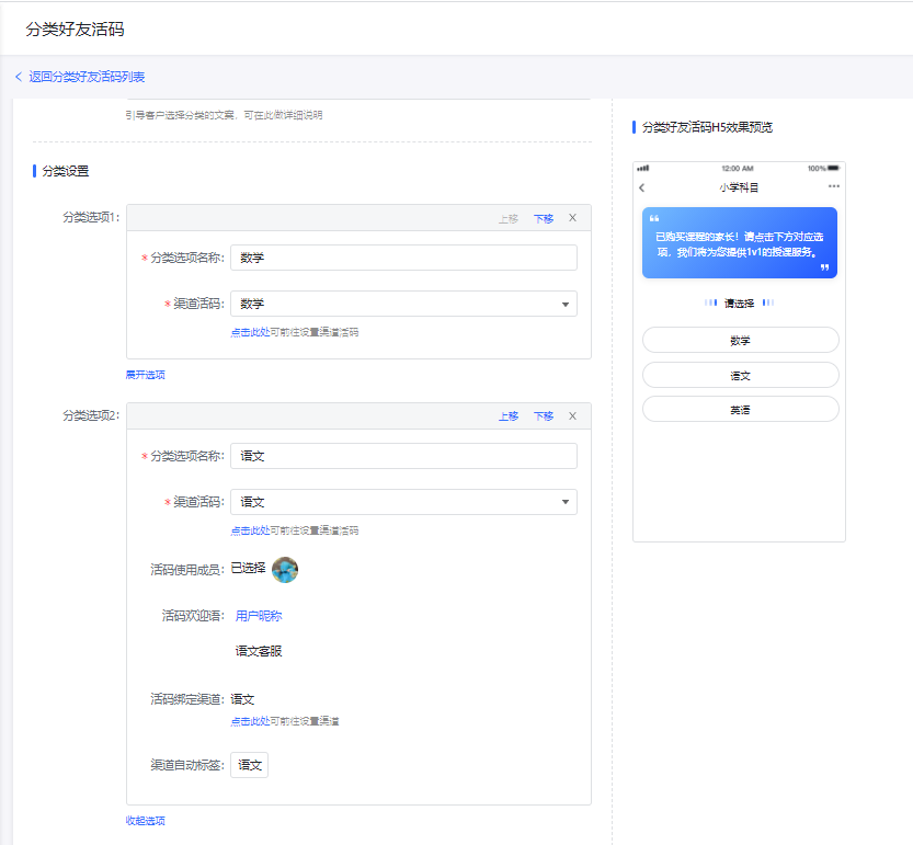 活码页面形式为H5,企业可在页面中配置标签选项及引导文案。客户点击不同选项会跳转到不同的渠道活码页面,从而实现分流的效果。建议不同选项对应的渠道活码的客服成员不要重复配置。