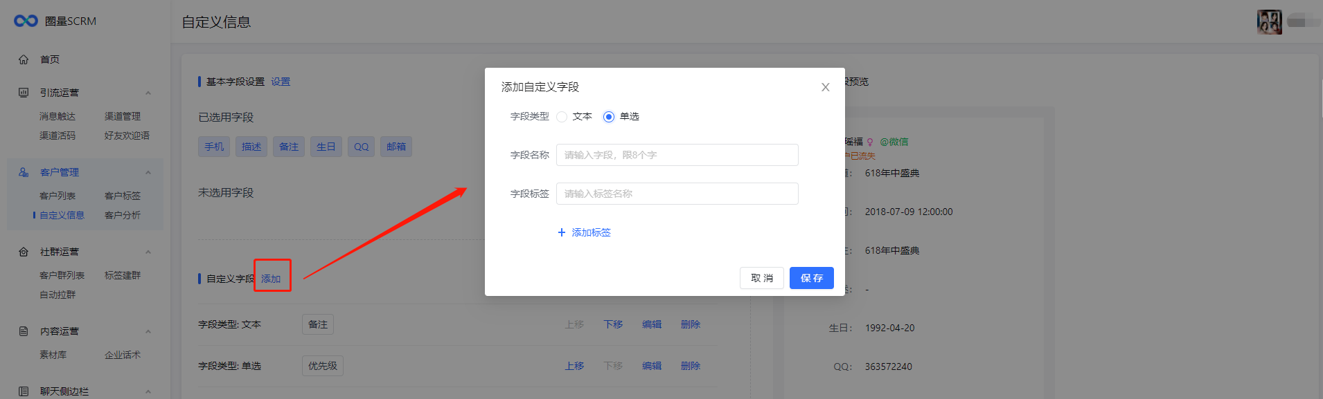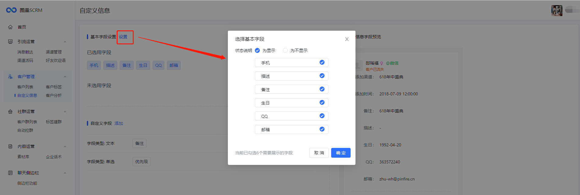 企业可结合实际情况设置字段是否显示,目前基本字段类型包含:手机、描述、备注、生日、QQ、邮箱。